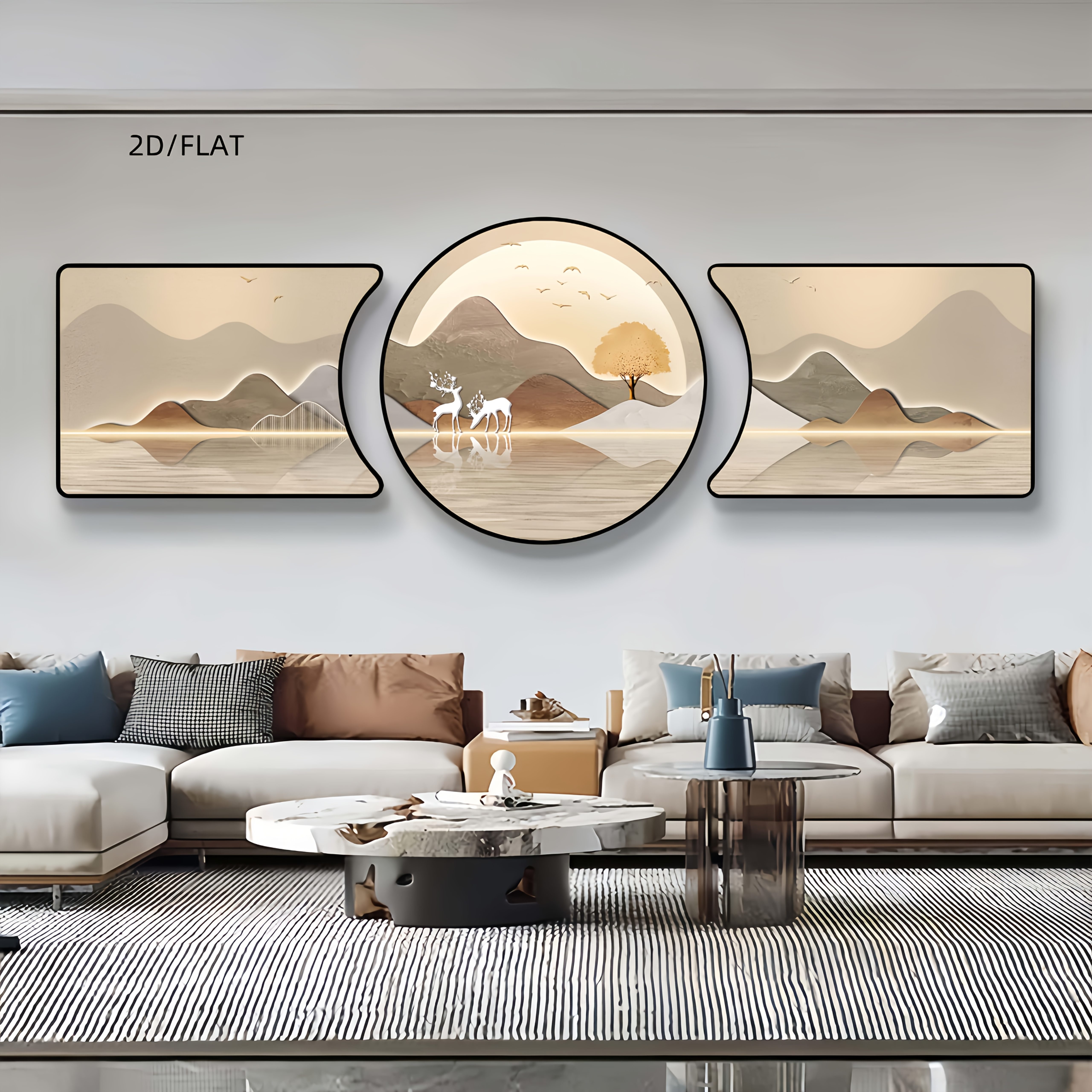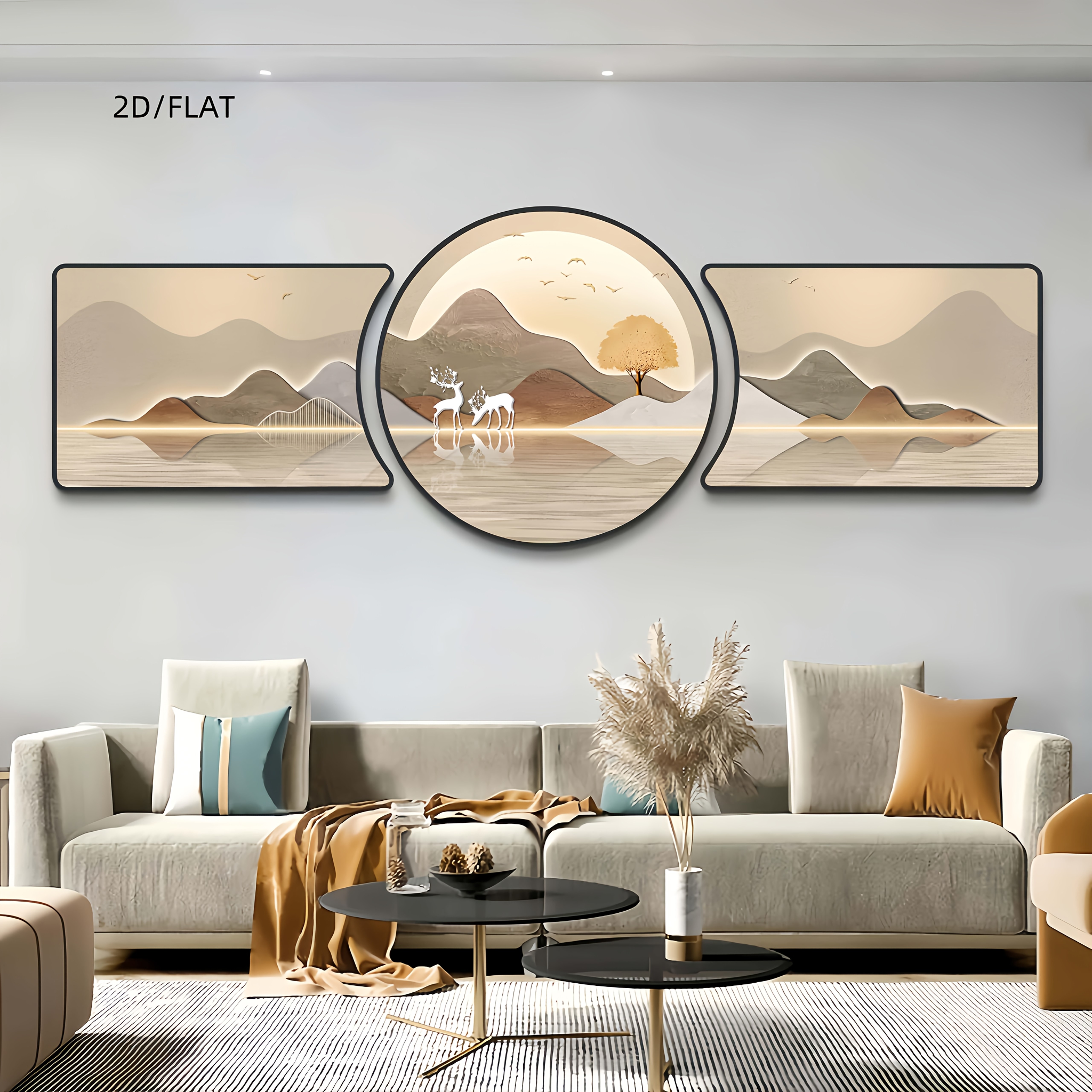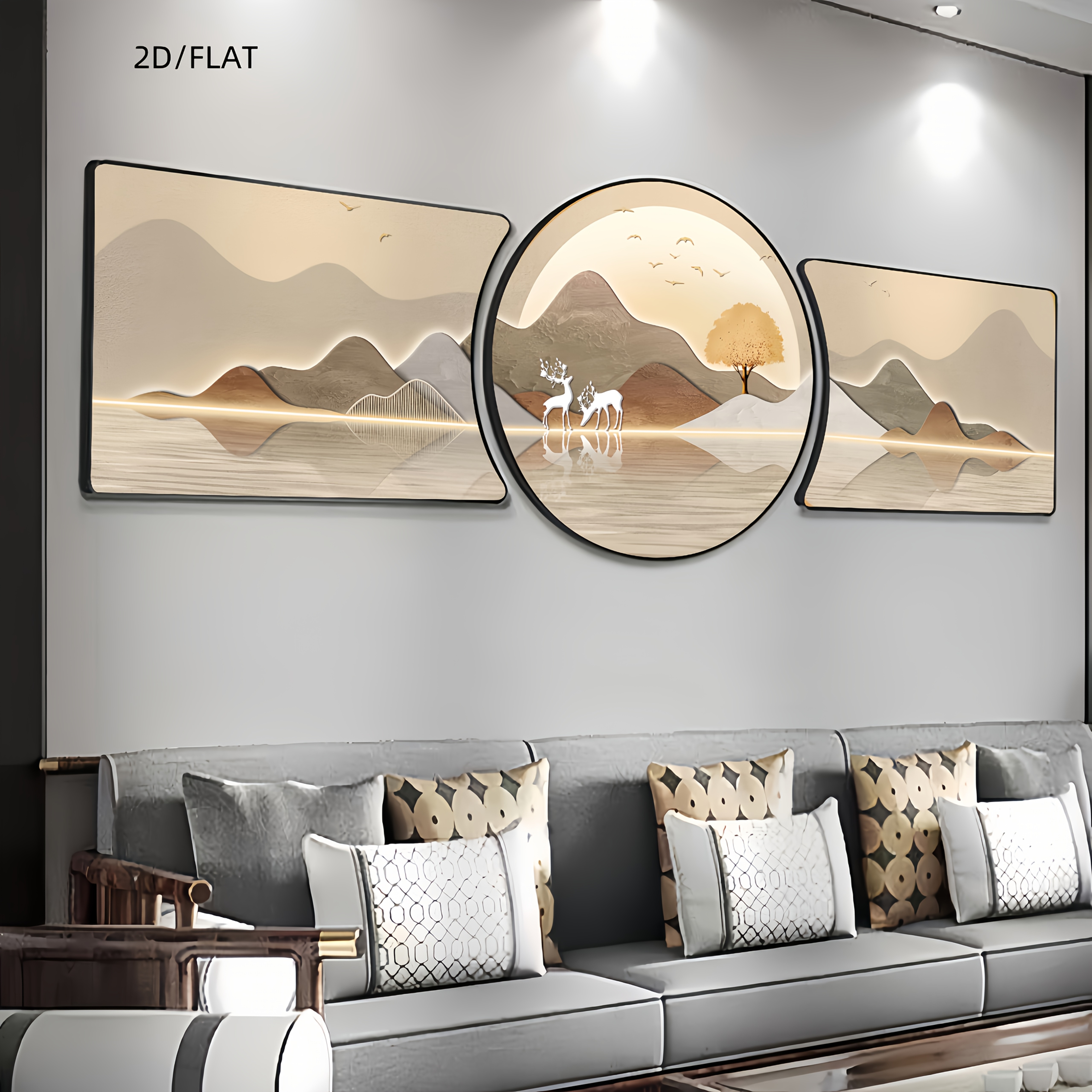 2D Flat 2D/FLAT 3pcs High-End Crystal Porcelain, New Chinese-Style Luxury Sofa Background Wall Decoration, Landscape And Deer Combination Set, Exuding a Sense of Sophistication, Enhancing The Home Atmosphere.