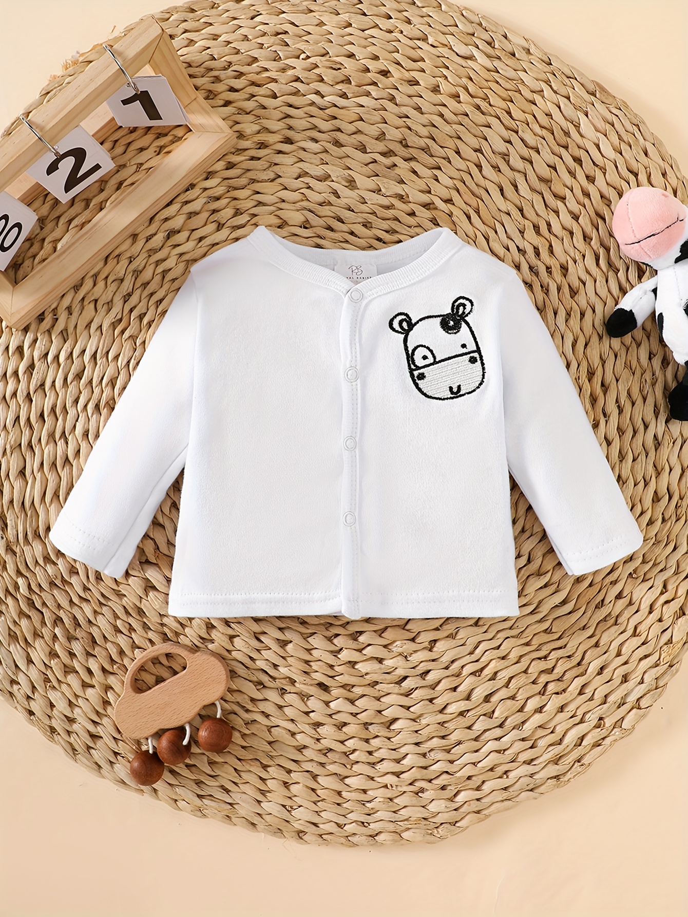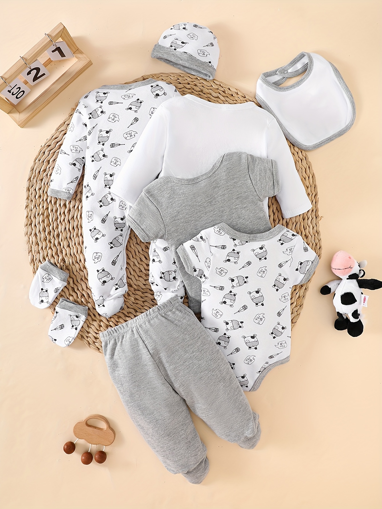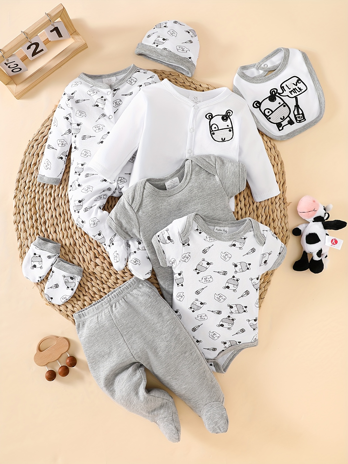 8pcs Newborn Baby Boy Set, 100% Cotton for Comfort and Breathability. Includes 4 Tops, Pants, Hat, Bib, and Socks with Adorable Cow Print. Suitable for Crawling and Playing, Fits 0-9 Months. Ideal as a Gift, Perfect for Outdo