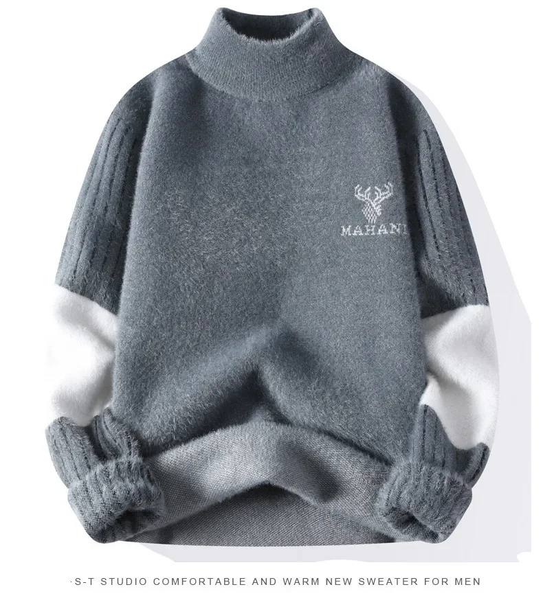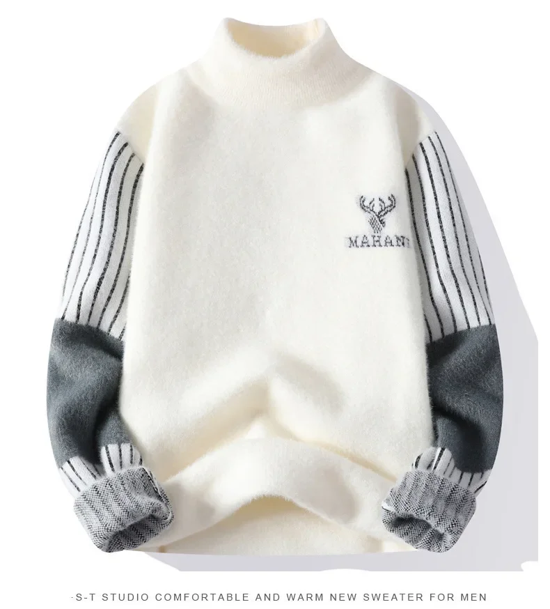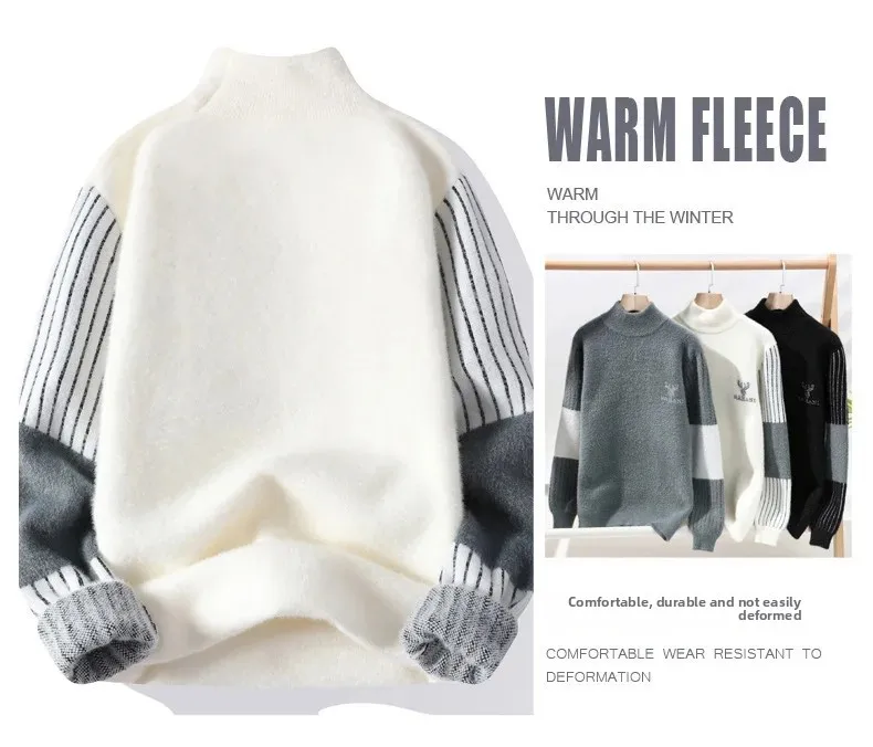 Men's Autumn Winter Thickened Fleece Lined Loose Knitted Sweater Half High Collar Warm Base Layer Knitted Sweater