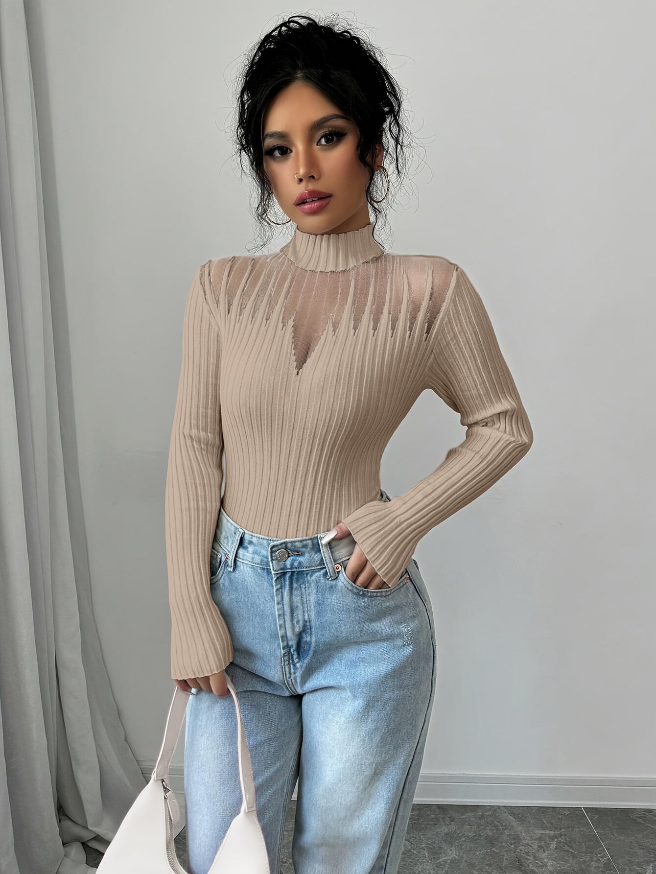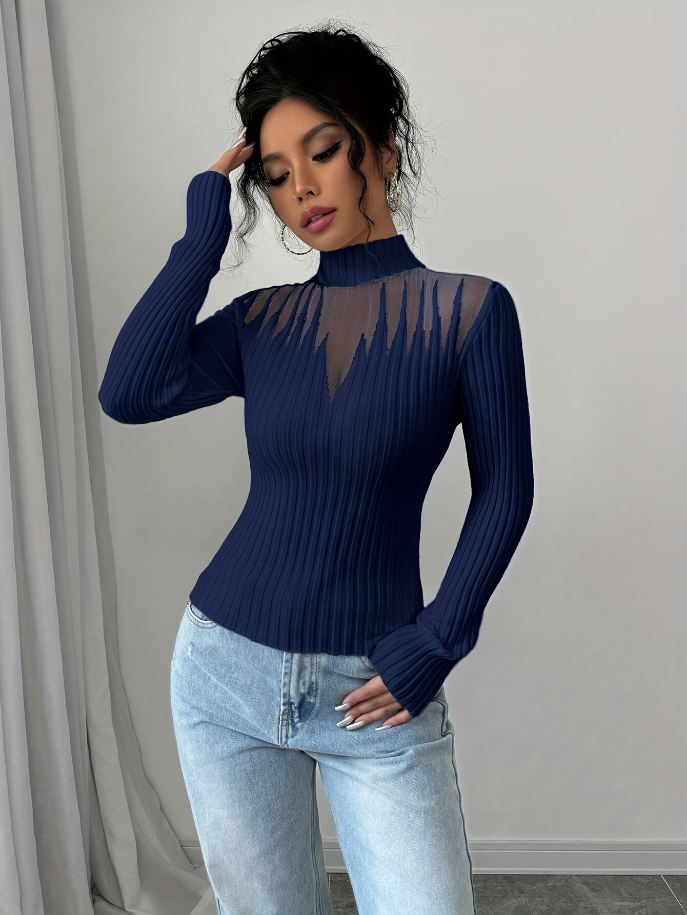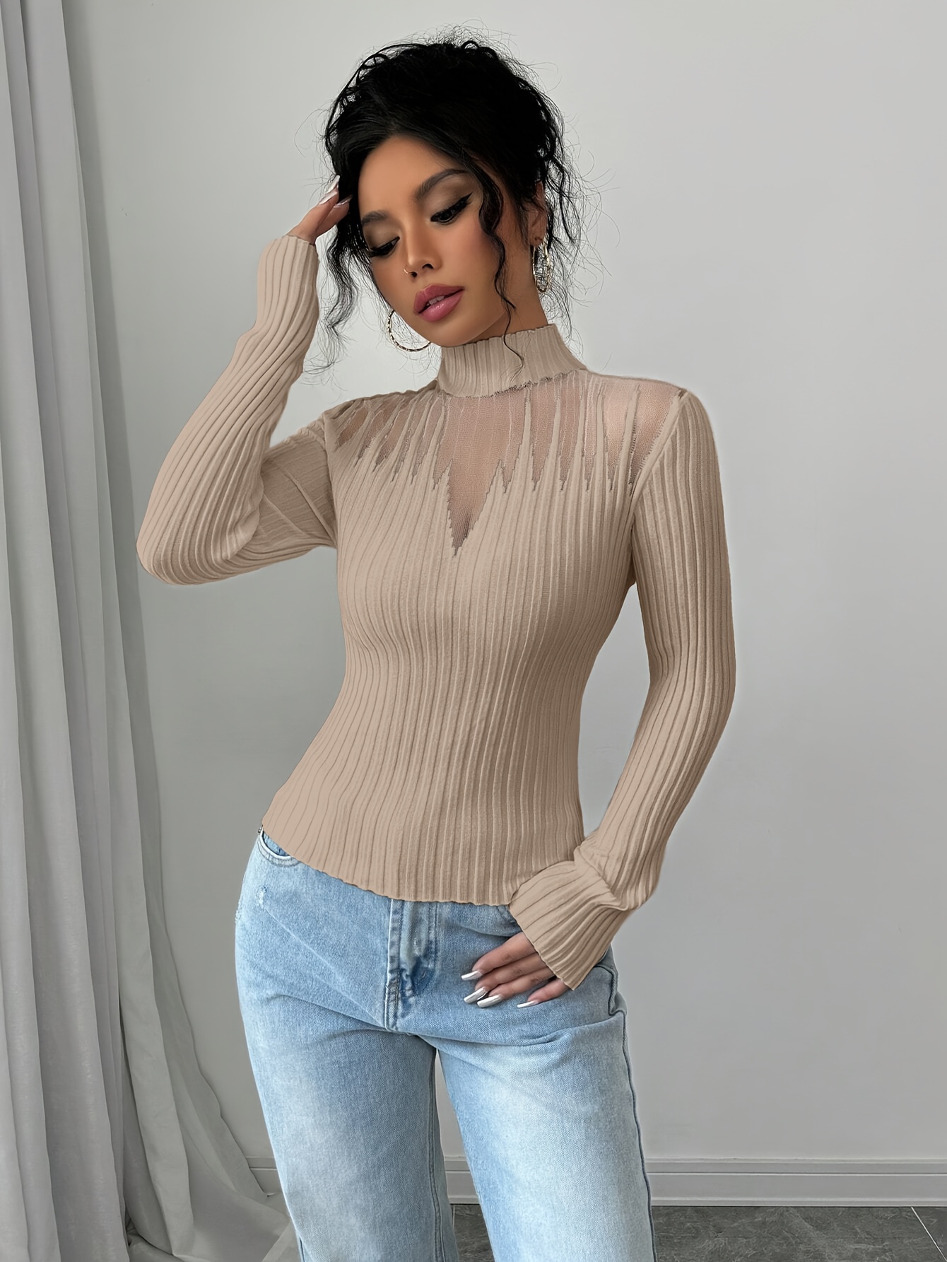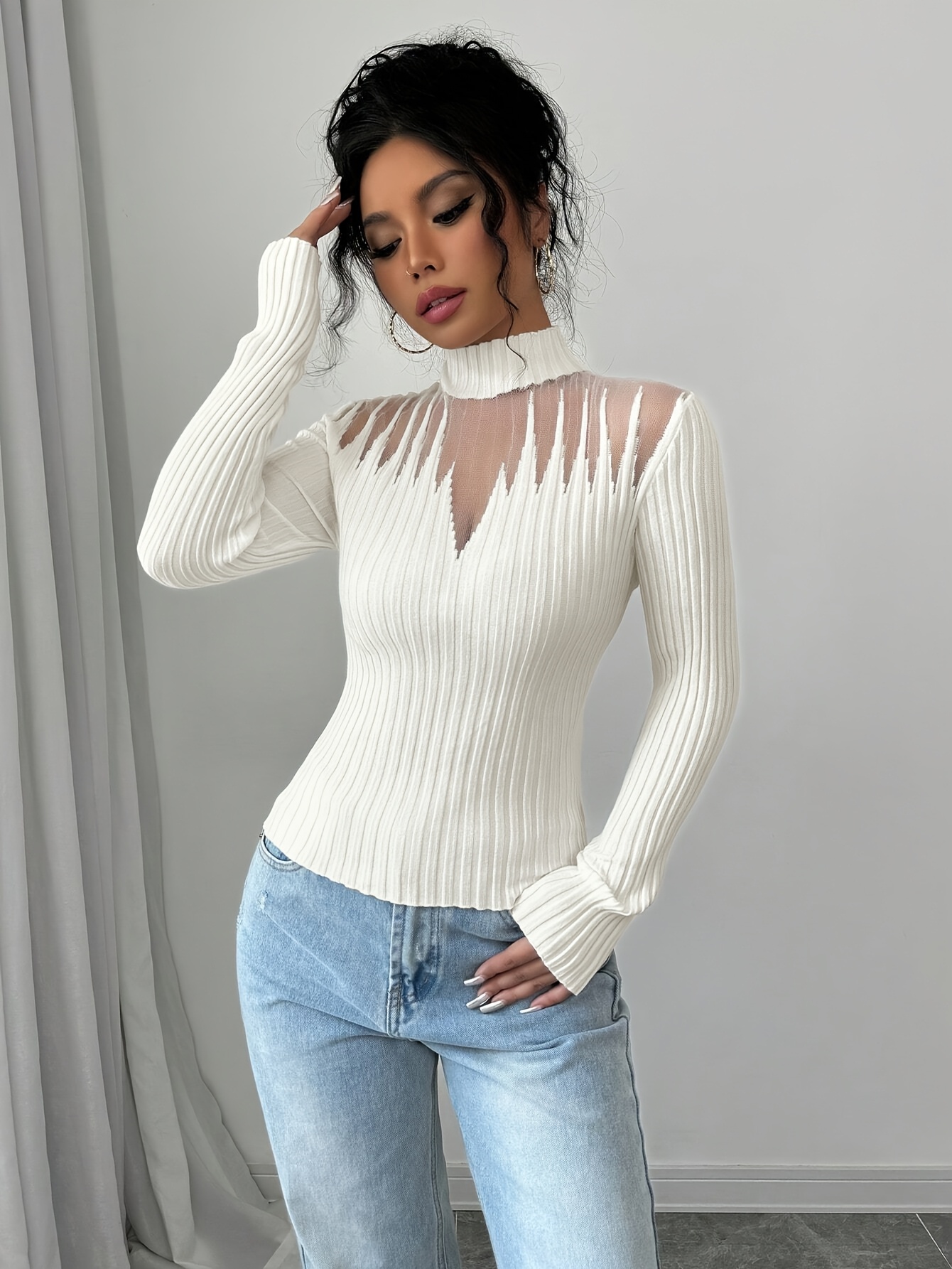 New Women's Sexy Elegant Fashion Turtleneck Top, Short Slim-Fit Long Sleeve, Exquisite Hollow Mesh Design, Beautiful Pullover