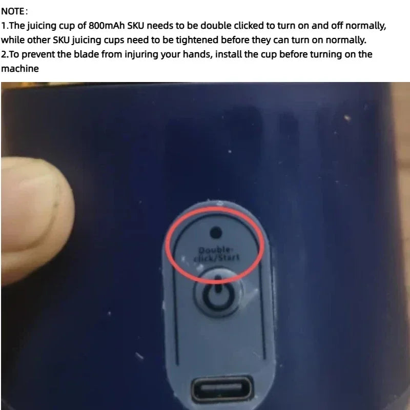A6.The 800mAh SKU juicer cup requires double clicking to turn on or off, not just clicking to turn on
