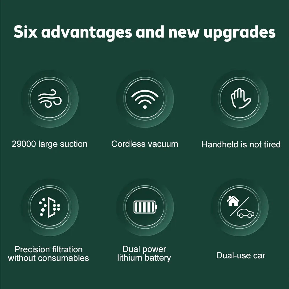 - 🫧【2.9KPa Strong Suction 】The handheld car vacuum has 2.9Kpa Strong Suction, Suitable for daily housework to clean up the dust. Output power 120W superpower motor provides strong suction up to 29000pa, which can quickly and easily remove food residues, particles, and pet hair around the house or in the car. Wet/Dry vacuum wireless mobile operation is more convenient.