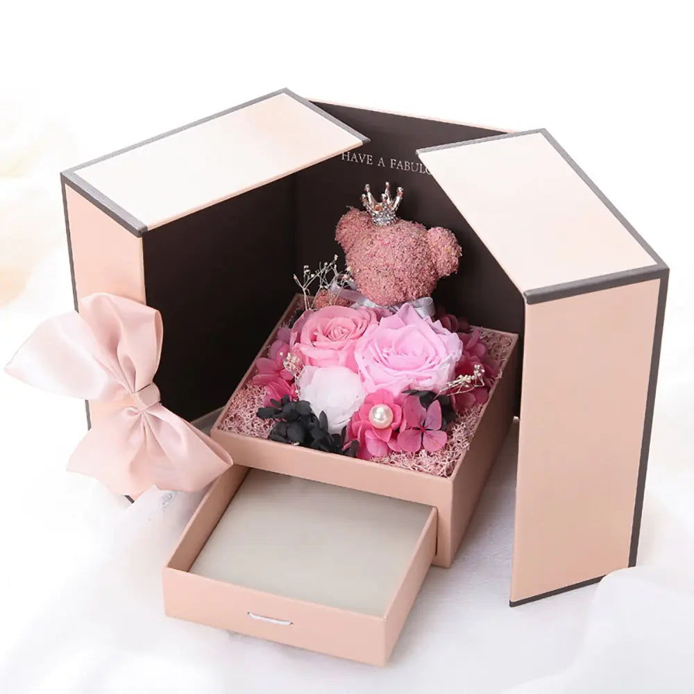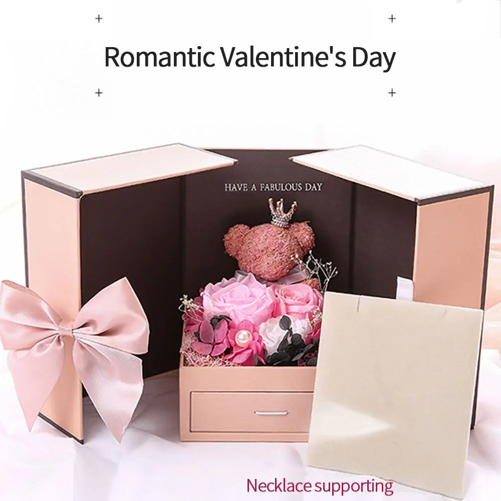 Crafted to perfection, this exquisite jewelry box is more than just a storage solution – it's a symbol of everlasting affection. Adorned with delicate pink roses and charming pink bears, its enchanting design is sure to captivate her heart on any occasion.