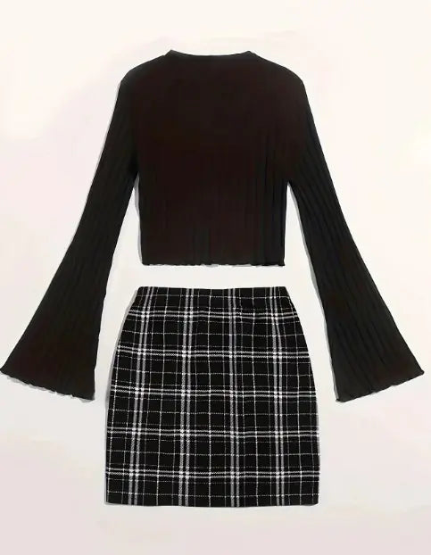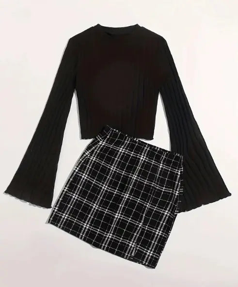 Versatile Style: This two-piece set is perfect for a variety of occasions, from casual outings and weekend get-togethers to more polished events. The combination of the ribbed top and plaid skirt allows for multiple styling options.