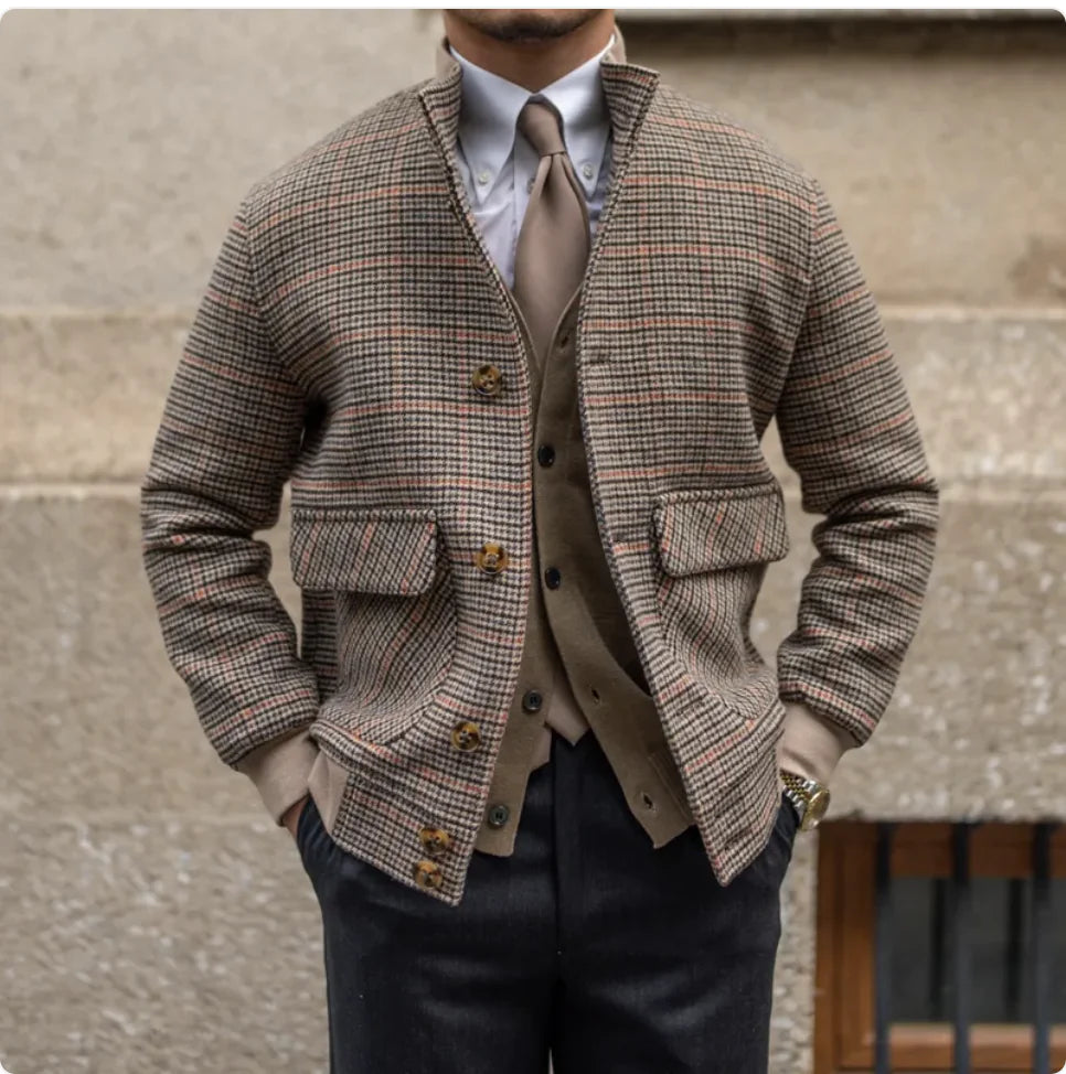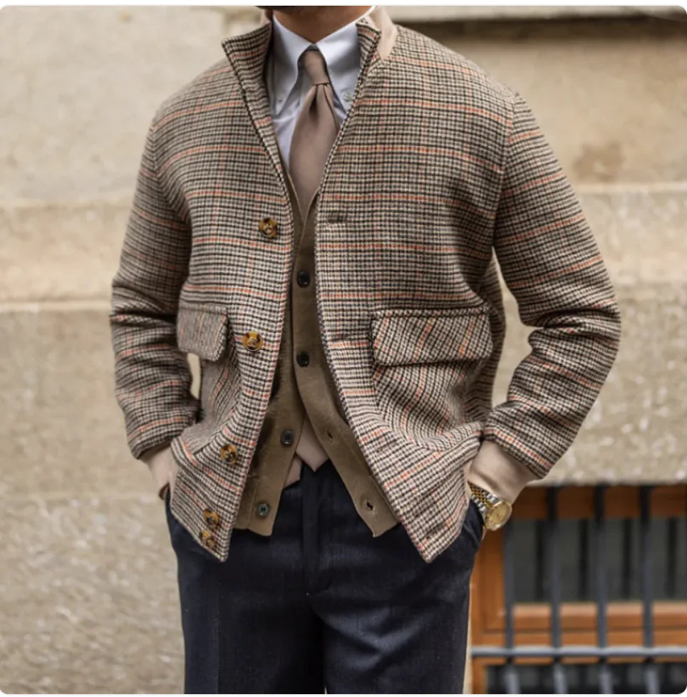 Cropped Slim-Fit Tweed Bomber Jacket with Fleece and Stand Collar