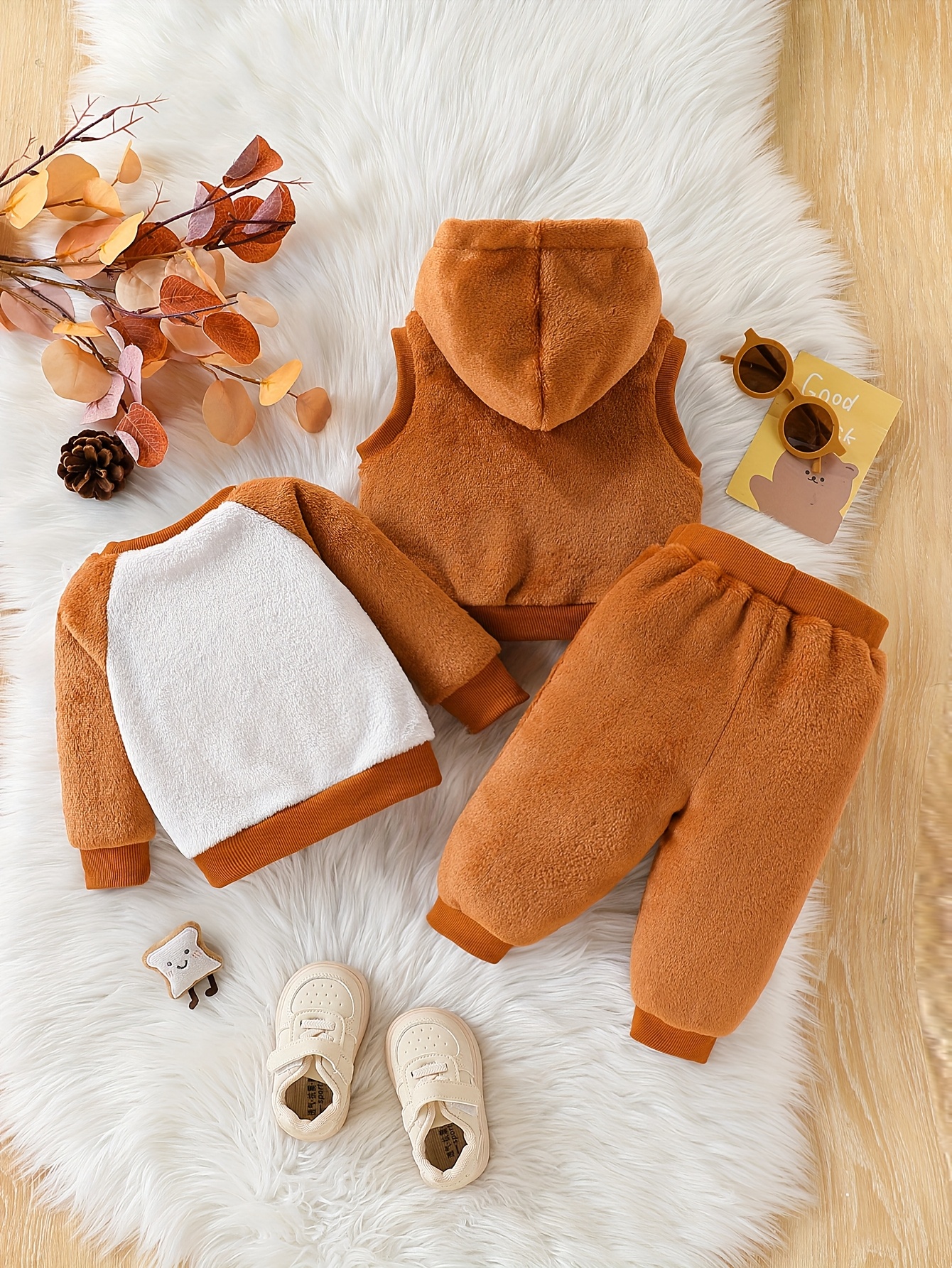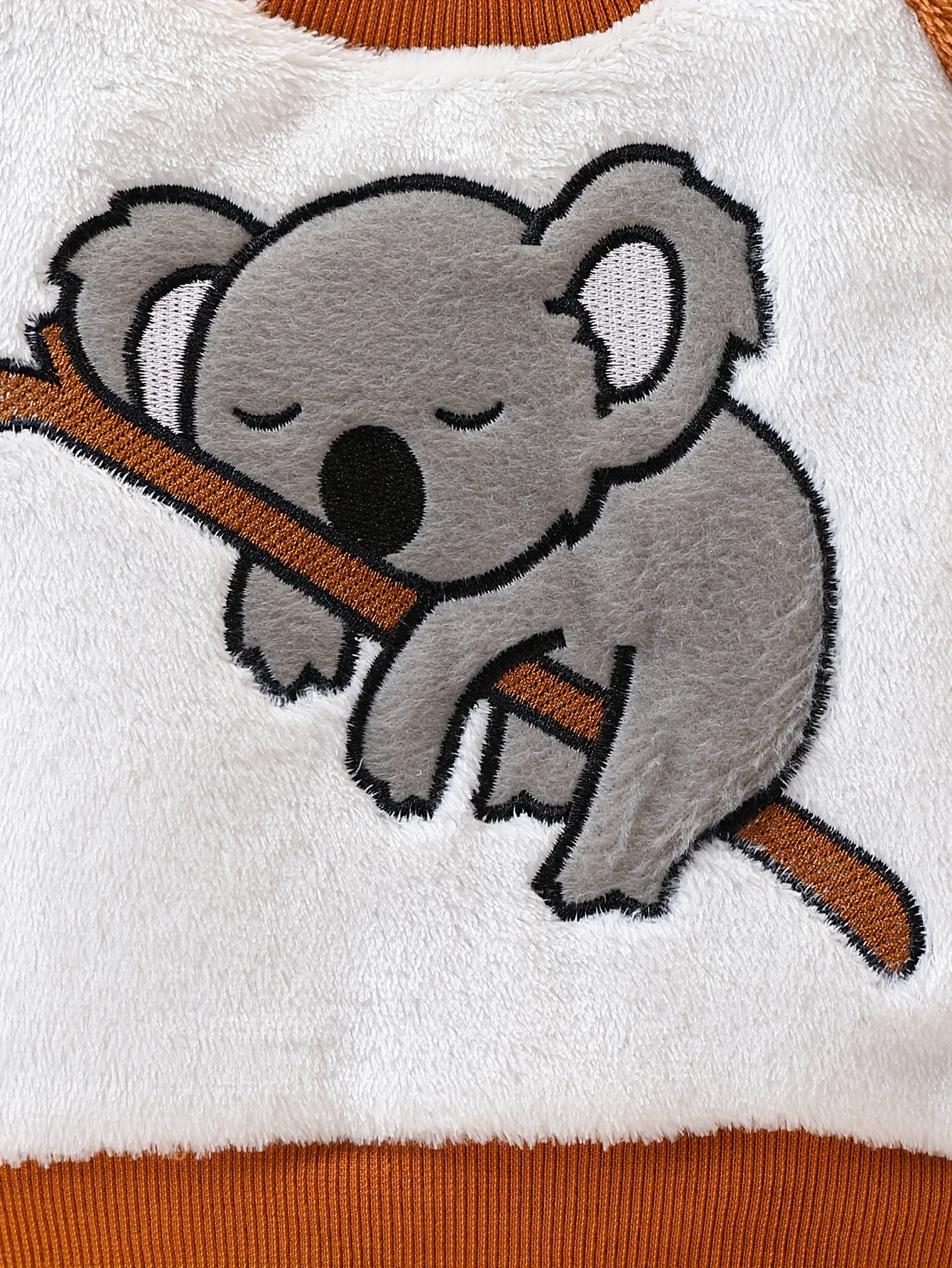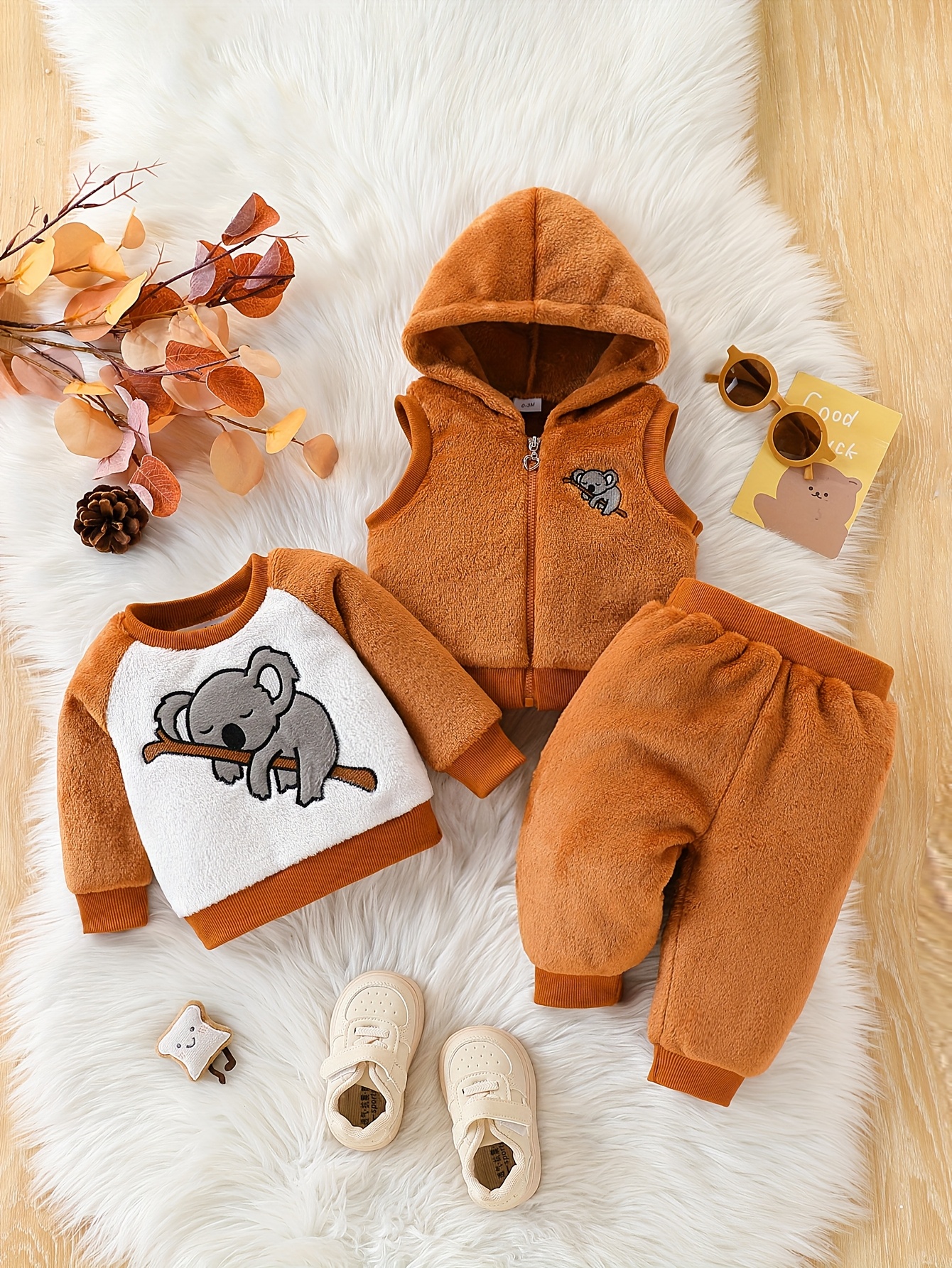 Cute Boys' Thickened Plush Outfit for Autumn/Winter, Featuring Cartoon Koala Embroidery, Long-Sleeve -Lined Warm Sweatshirt + -Lined Warm Pants + Hooded Zip-Up Vest, Three-Piece Set. Warm Autumn/Winter Clothing, Ideal for Out