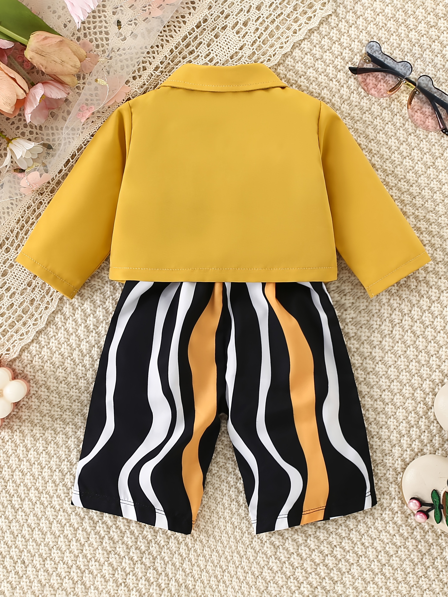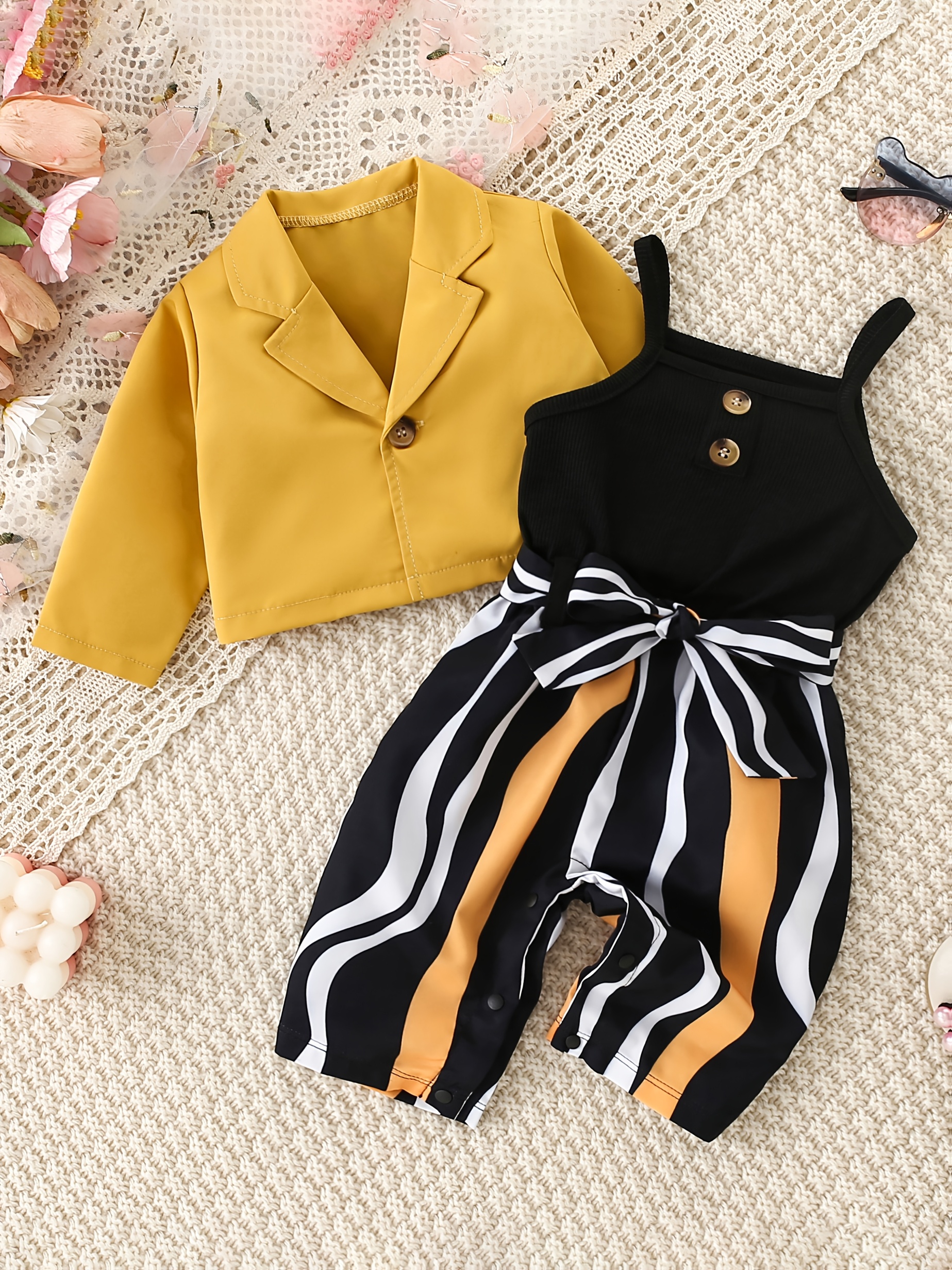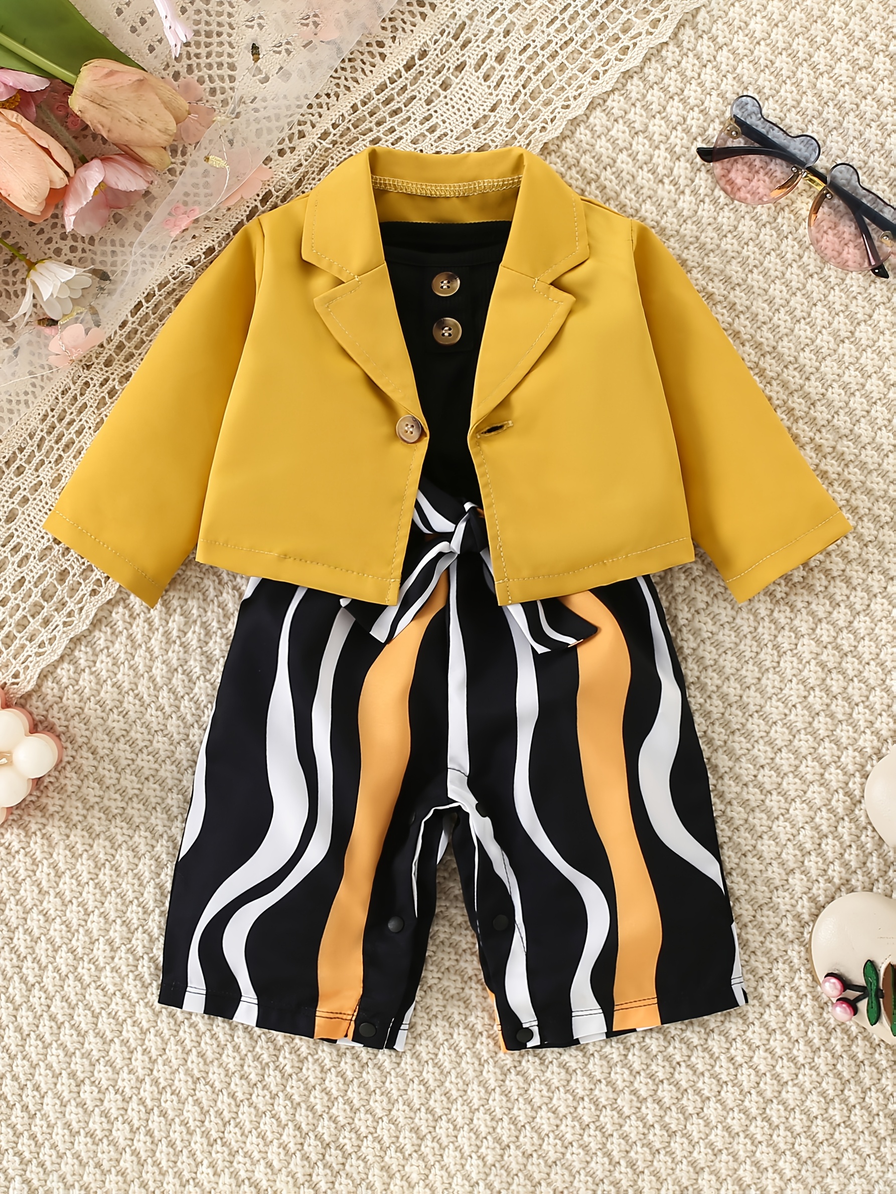 Girl's Spring/Autumn Outdoor Striped Print Romper with Jacket and Belt Three-Piece Set, Perfect for Outdoor