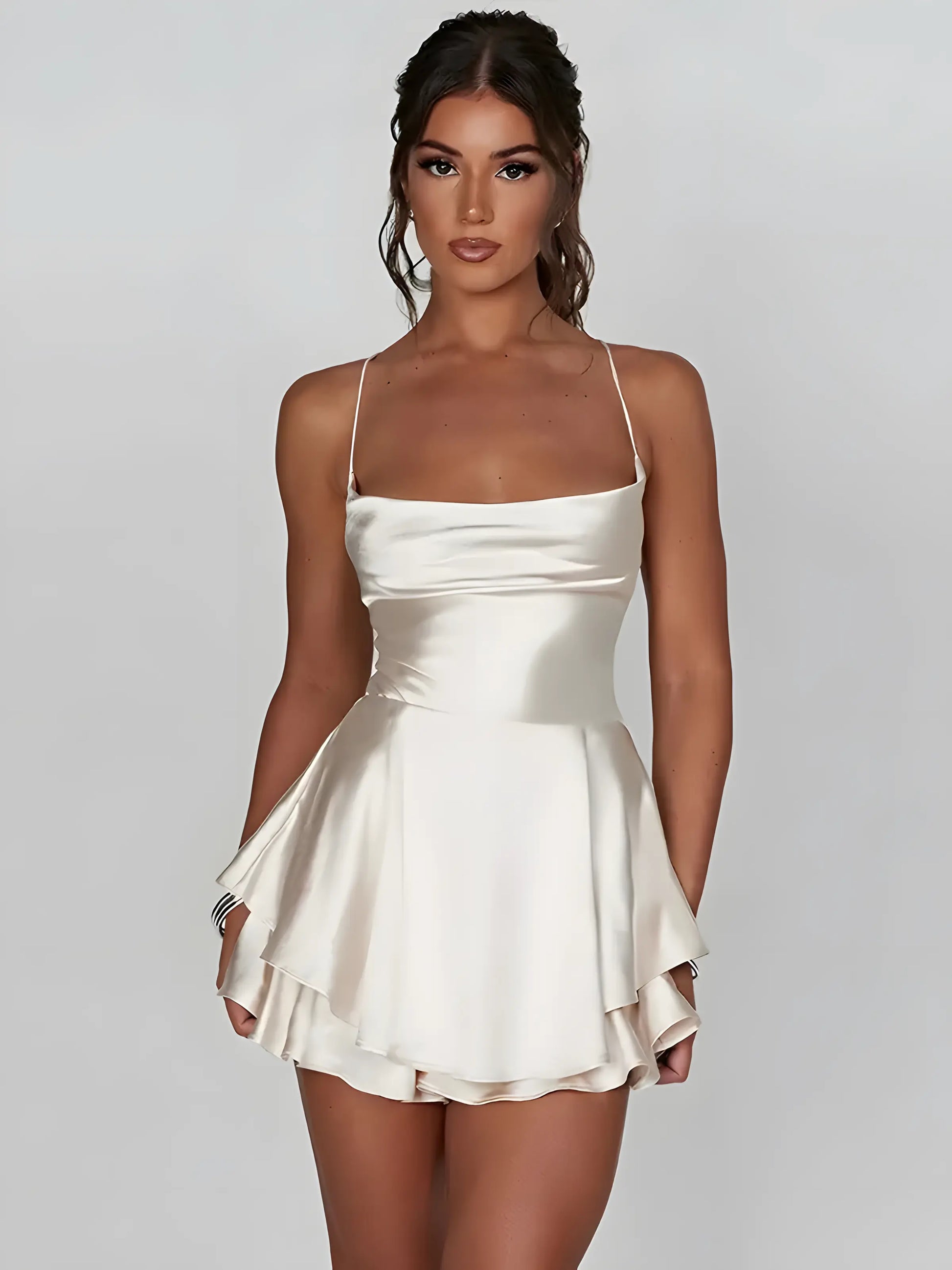 Add versatility to your wardrobe with the mini satin cami dress, a versatile piece that transitions seamlessly from day to night. Whether worn alone or layered under a jacket or sweater, this dress is a timeless addition that effortlessly complements your personal style.