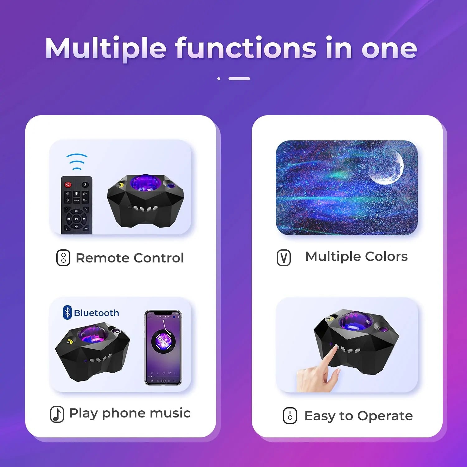 Feel the rhythm of the cosmos with the built-in Bluetooth music speaker. Simply connect your smartphone and watch as the lights dance in harmony with your favorite tunes. With 48 lighting modes, including a stunning aurora borealis effect, you can customize your cosmic experience to suit any mood.